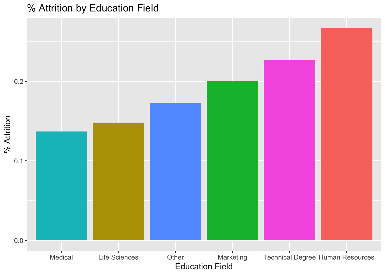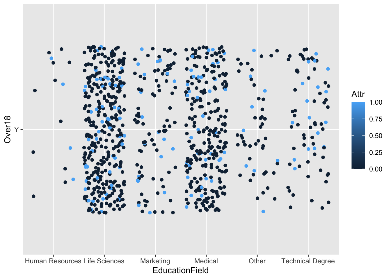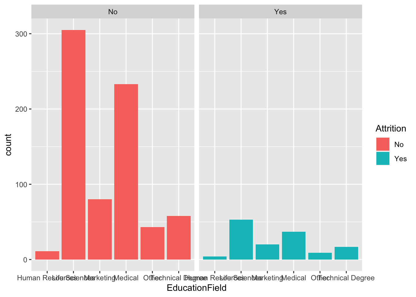 data %>% ggplot(aes(x = EducationField, fill = Attrition)) + geom_histogram(stat = "count") + facet_wrap(~Attrition)