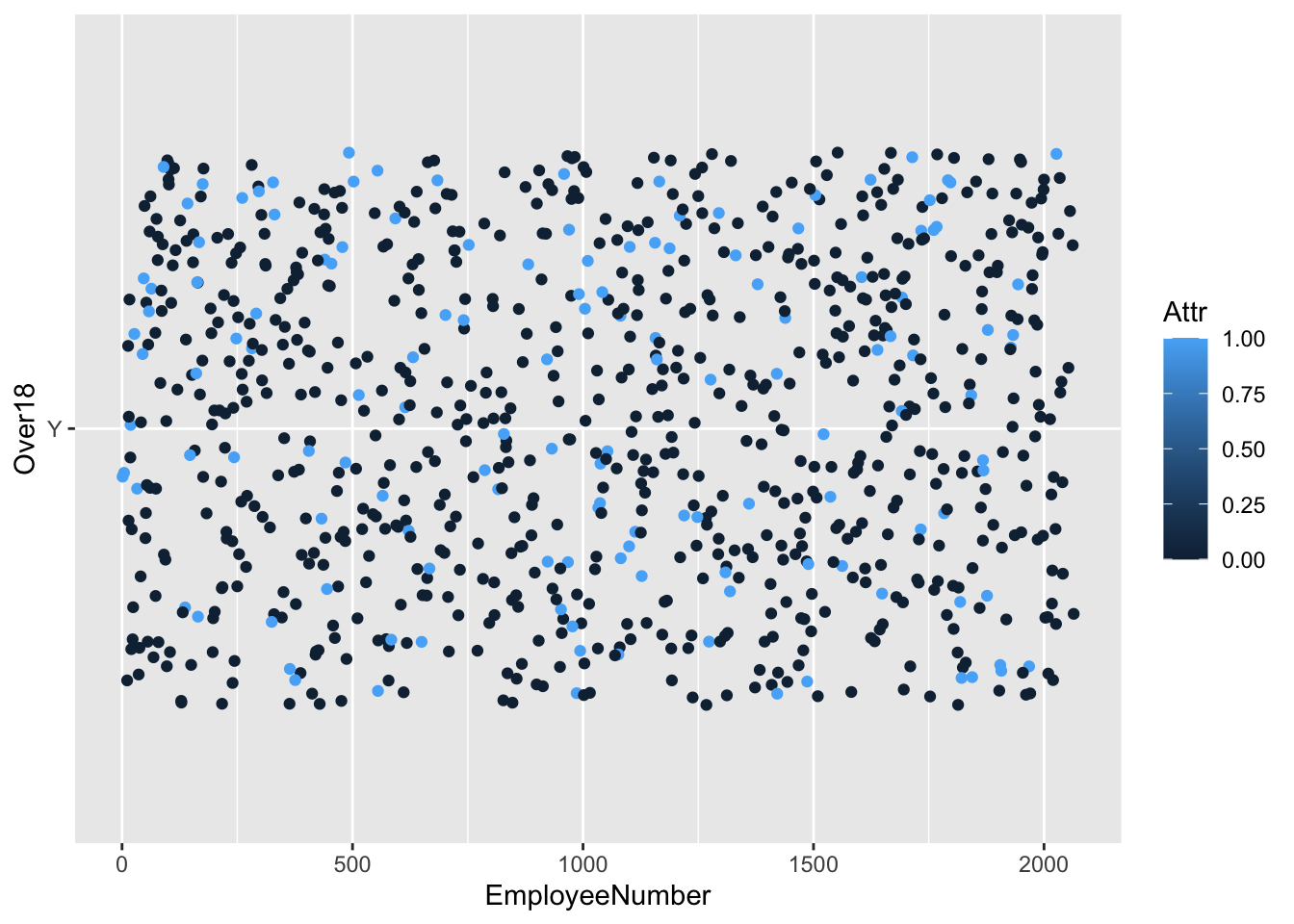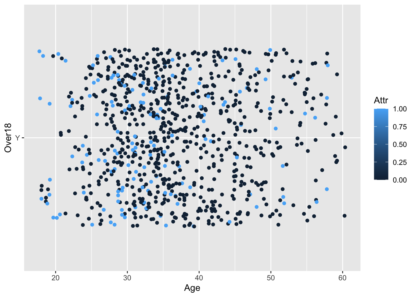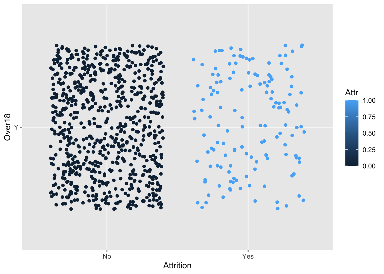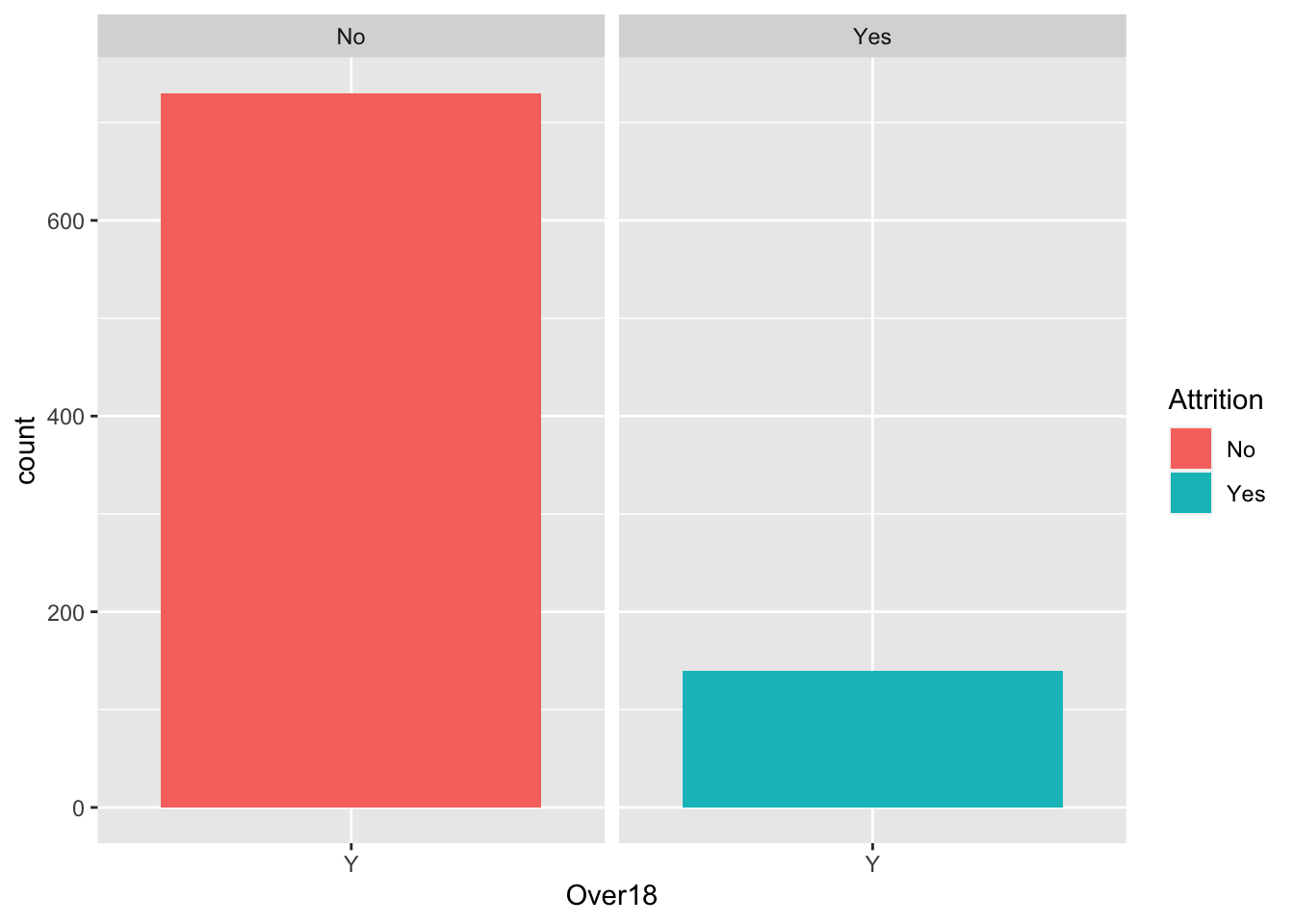 data %>% ggplot(aes(x = Over18, fill = Attrition)) + geom_histogram(stat = "count") + facet_wrap(~Attrition)