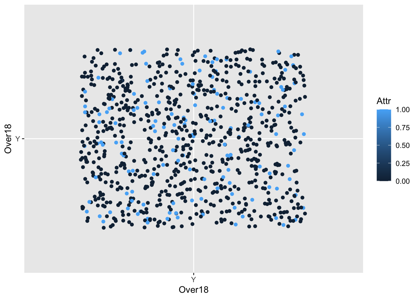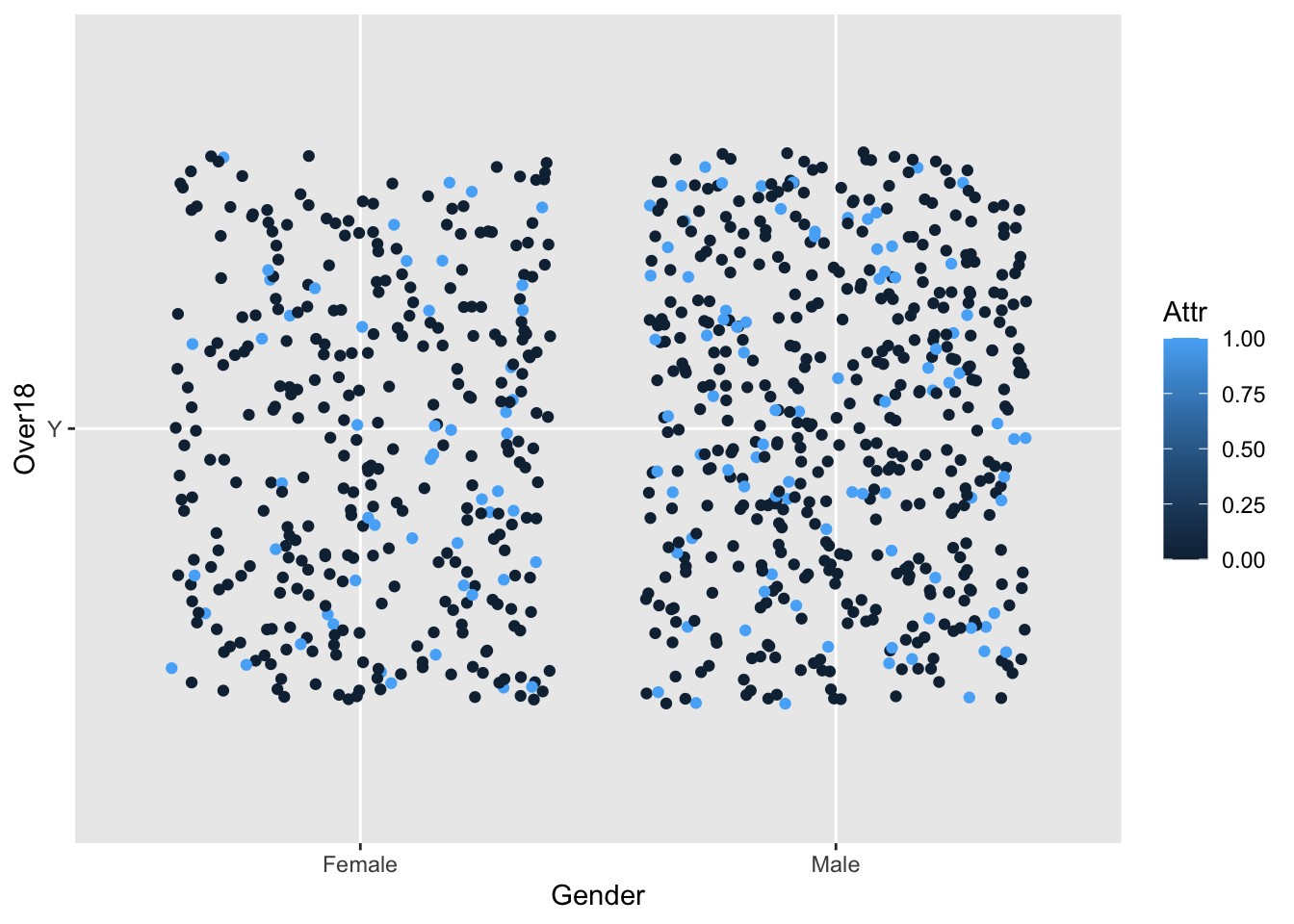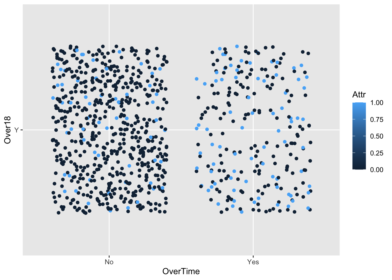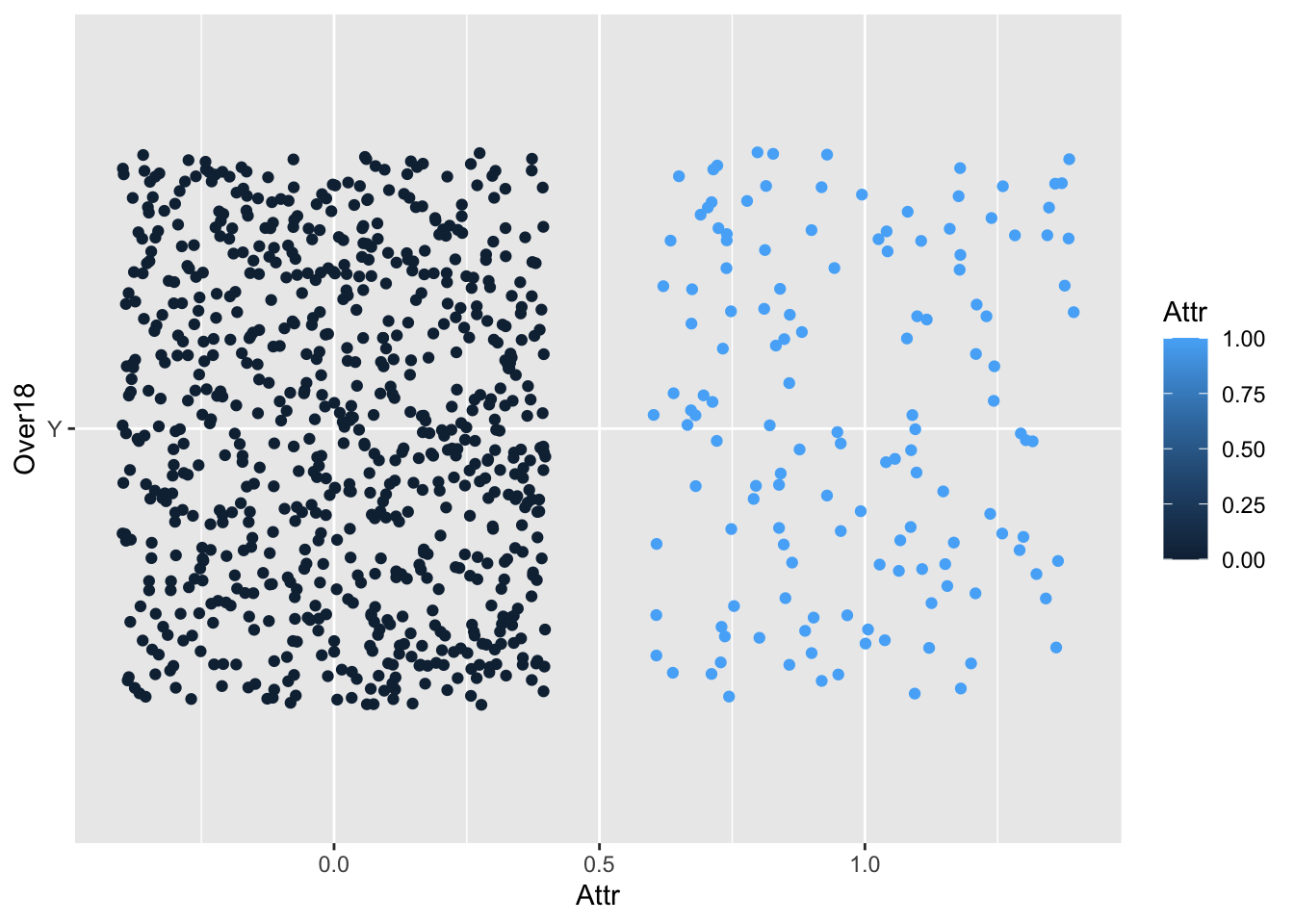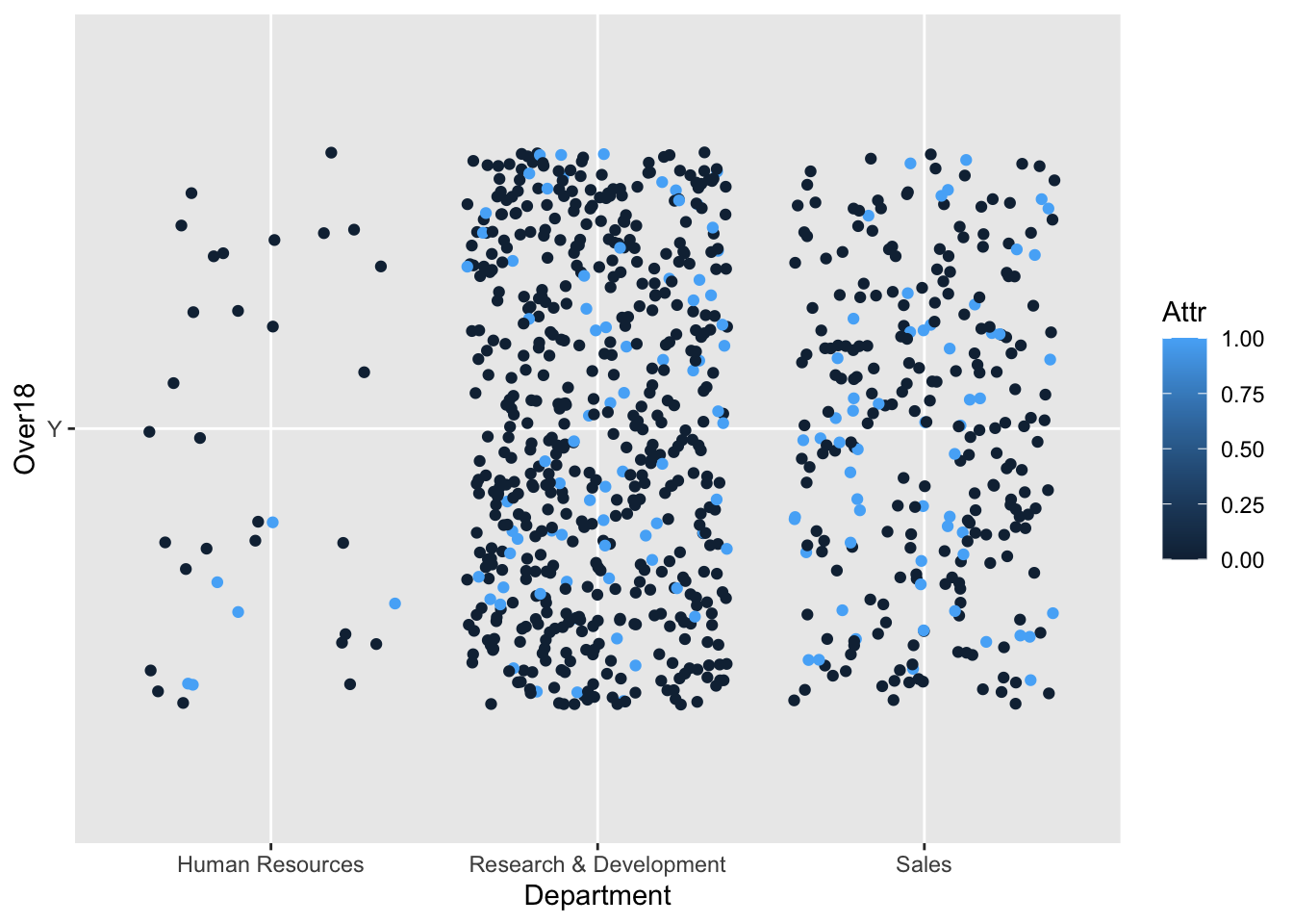 data %>% ggplot(aes(x = Over18, fill = Attrition)) + geom_histogram(stat = "count") + facet_wrap(~Attrition)