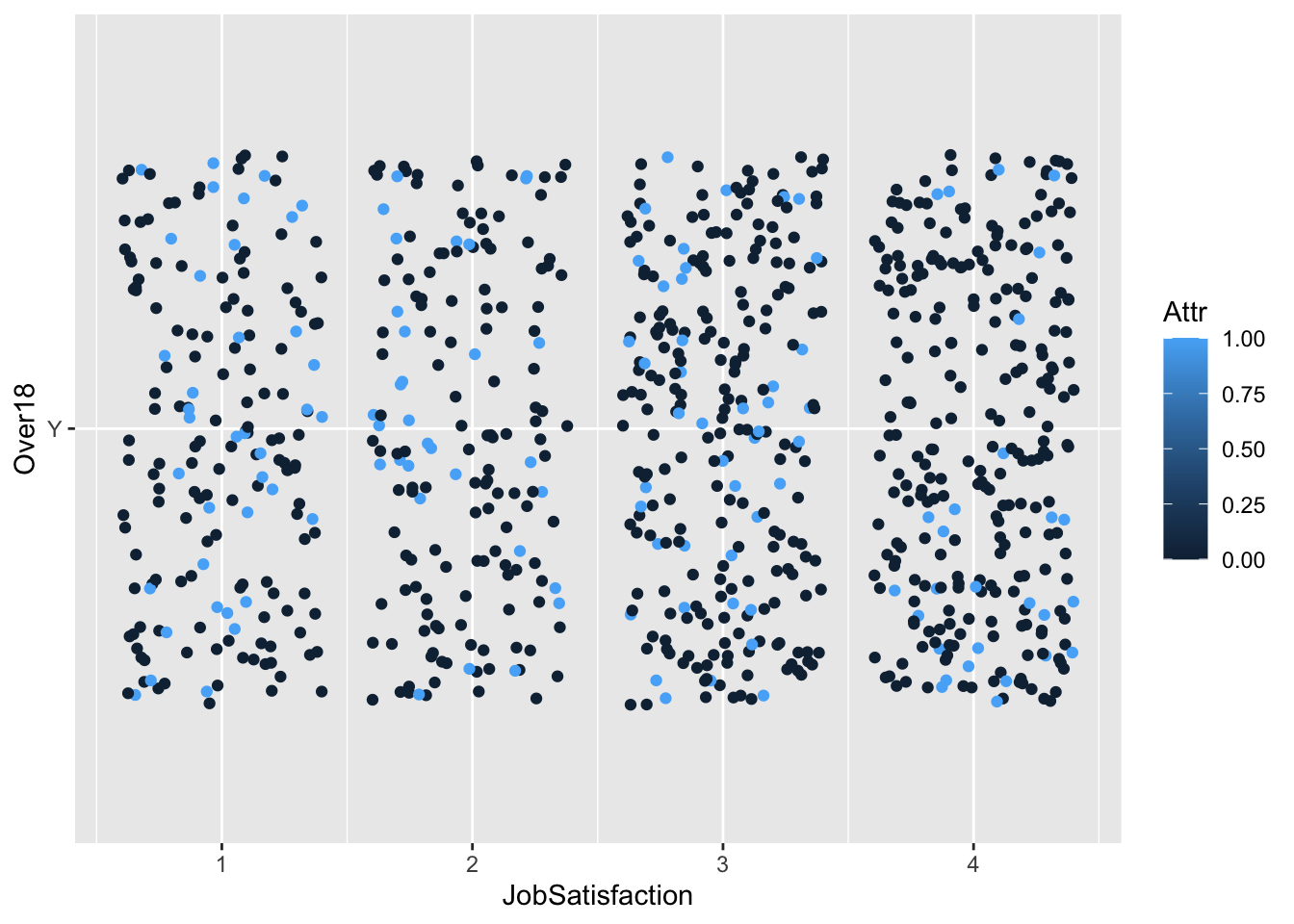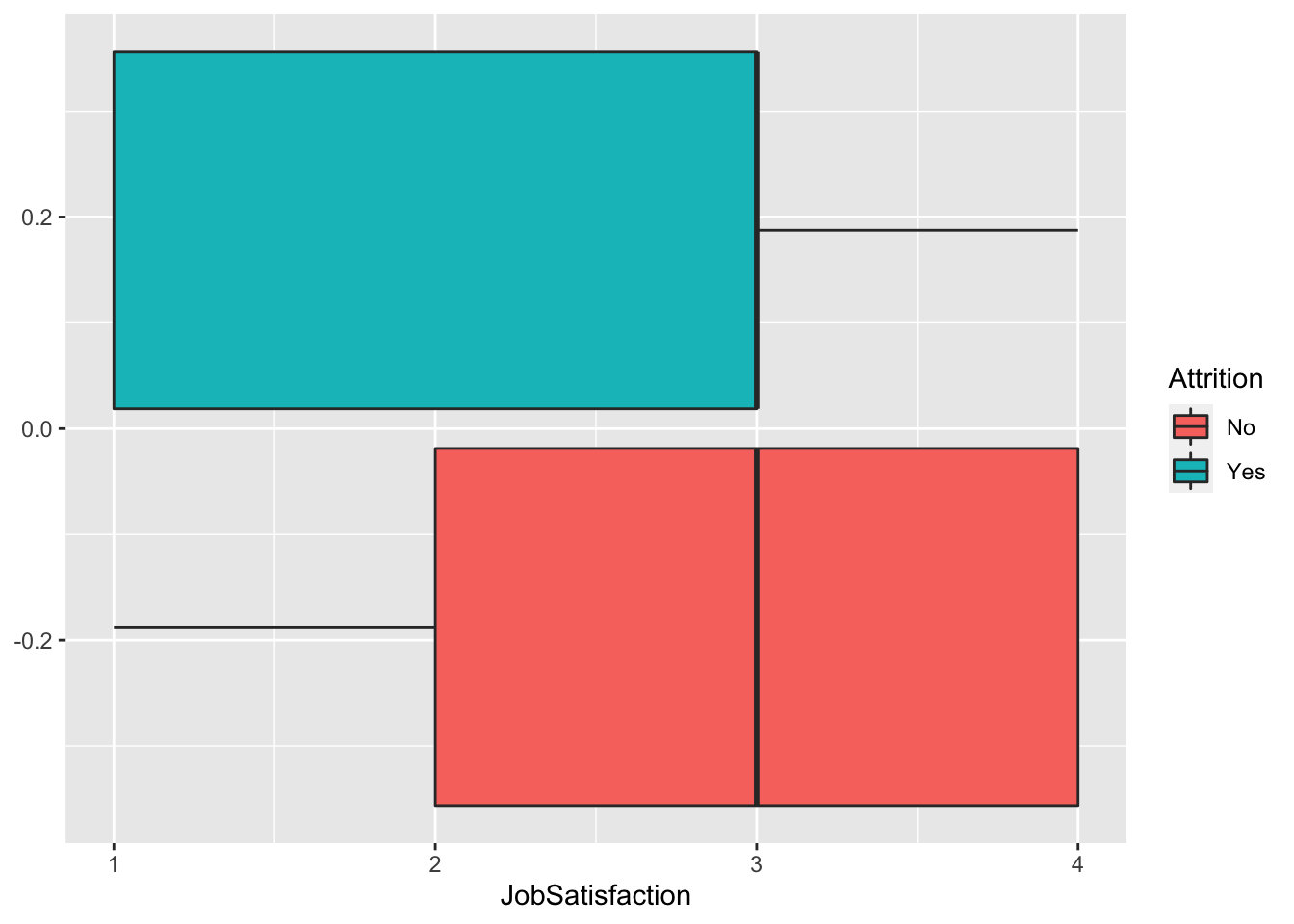 data %>% ggplot(aes(x = JobSatisfaction, fill = Attrition)) + geom_boxplot()