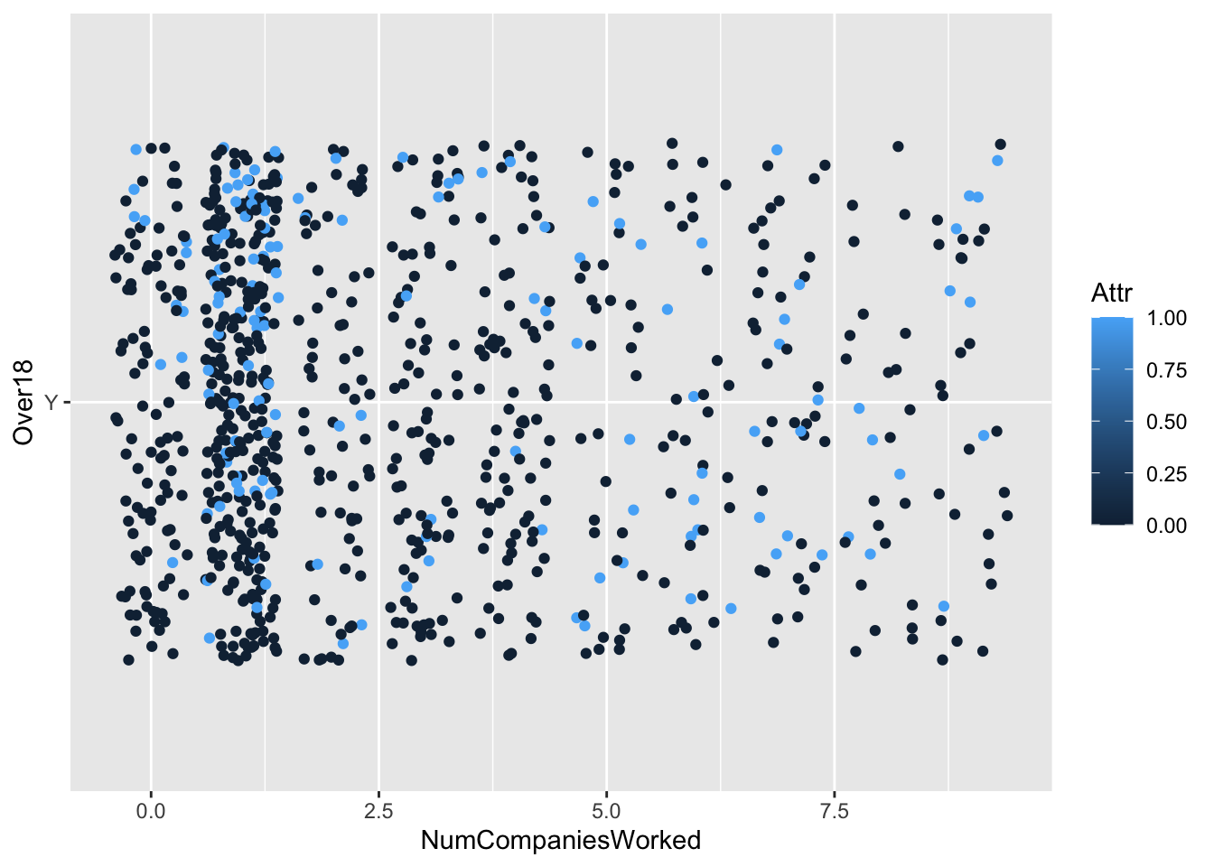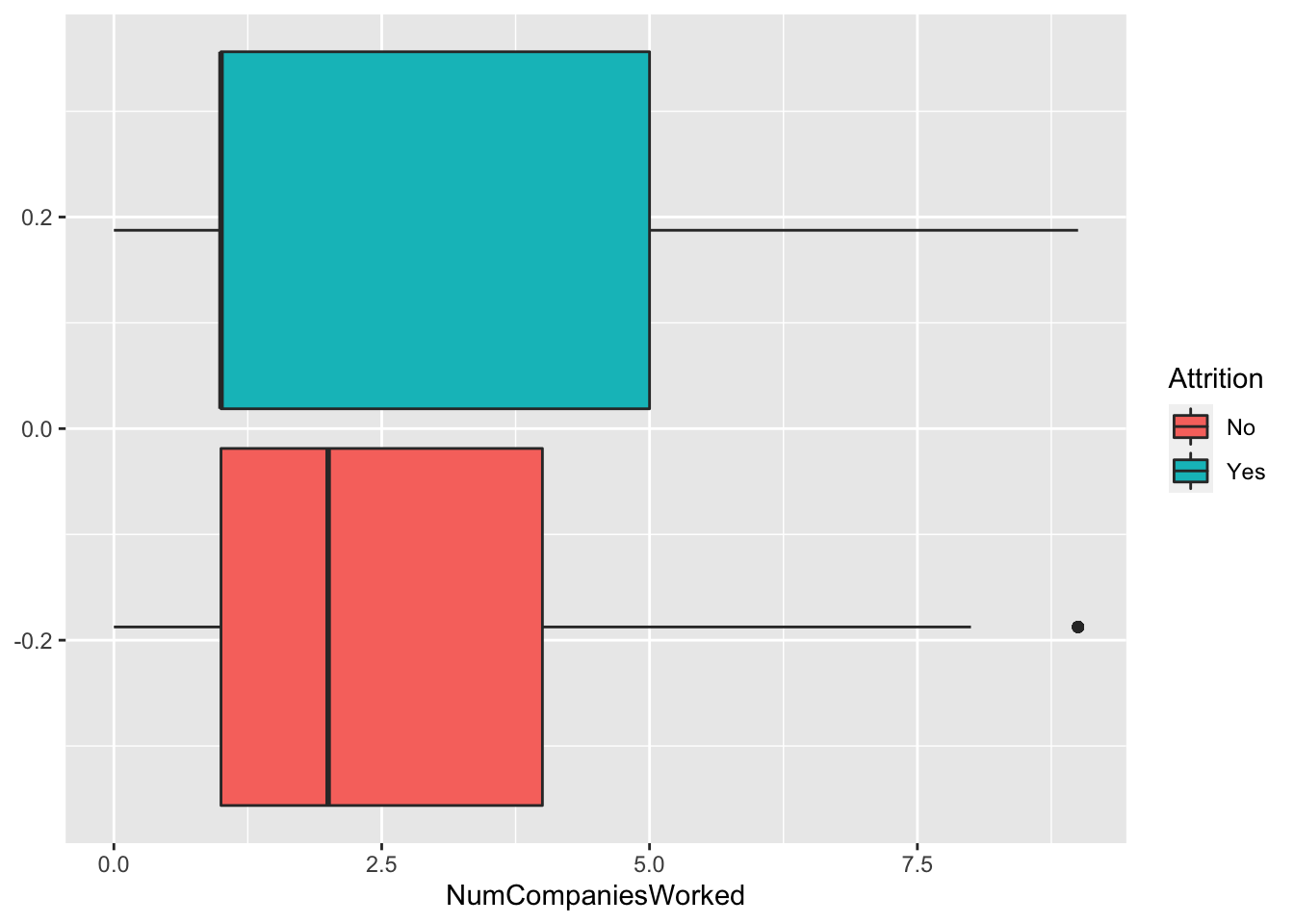data %>% ggplot(aes(x = NumCompaniesWorked, fill = Attrition)) + geom_boxplot()