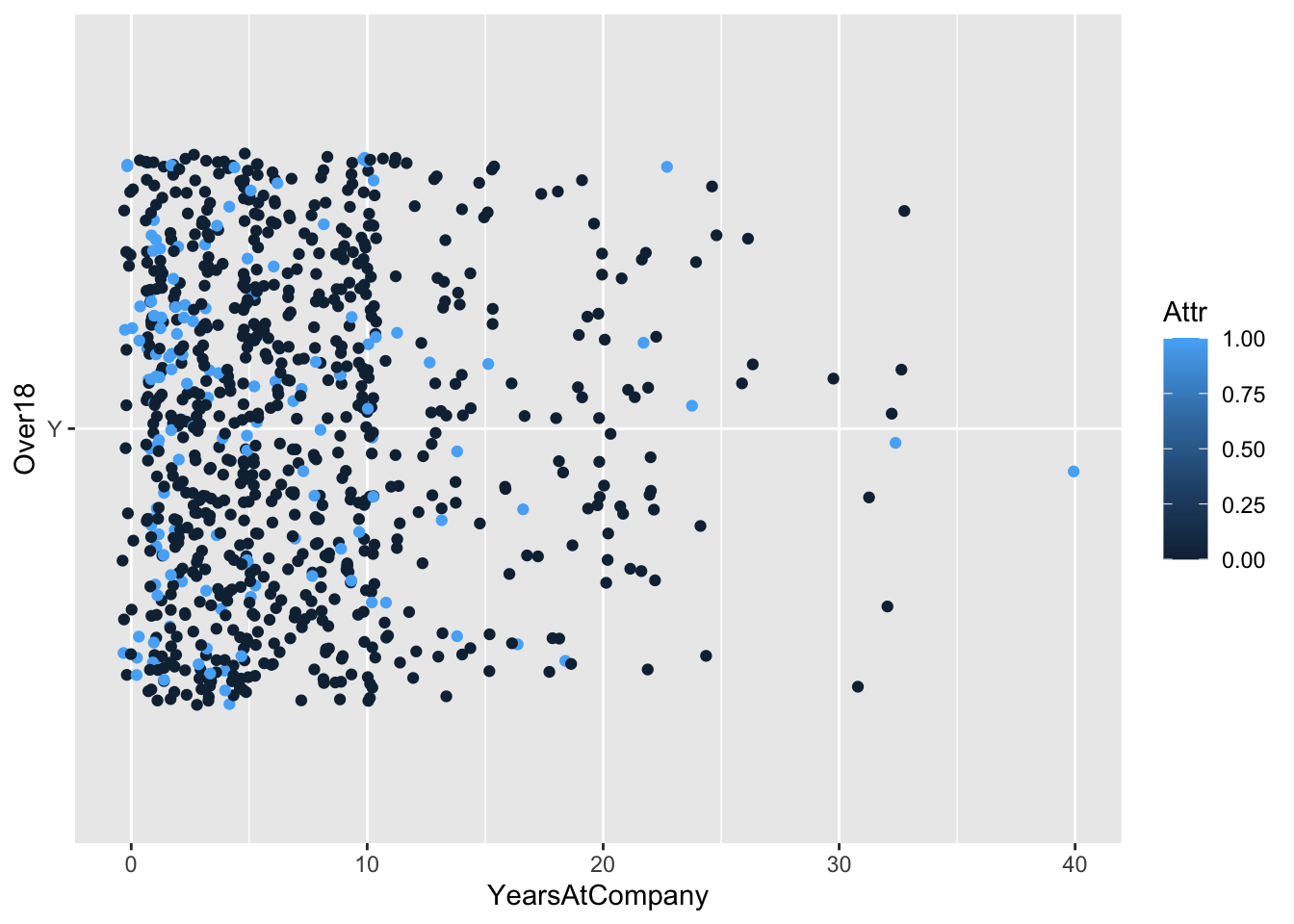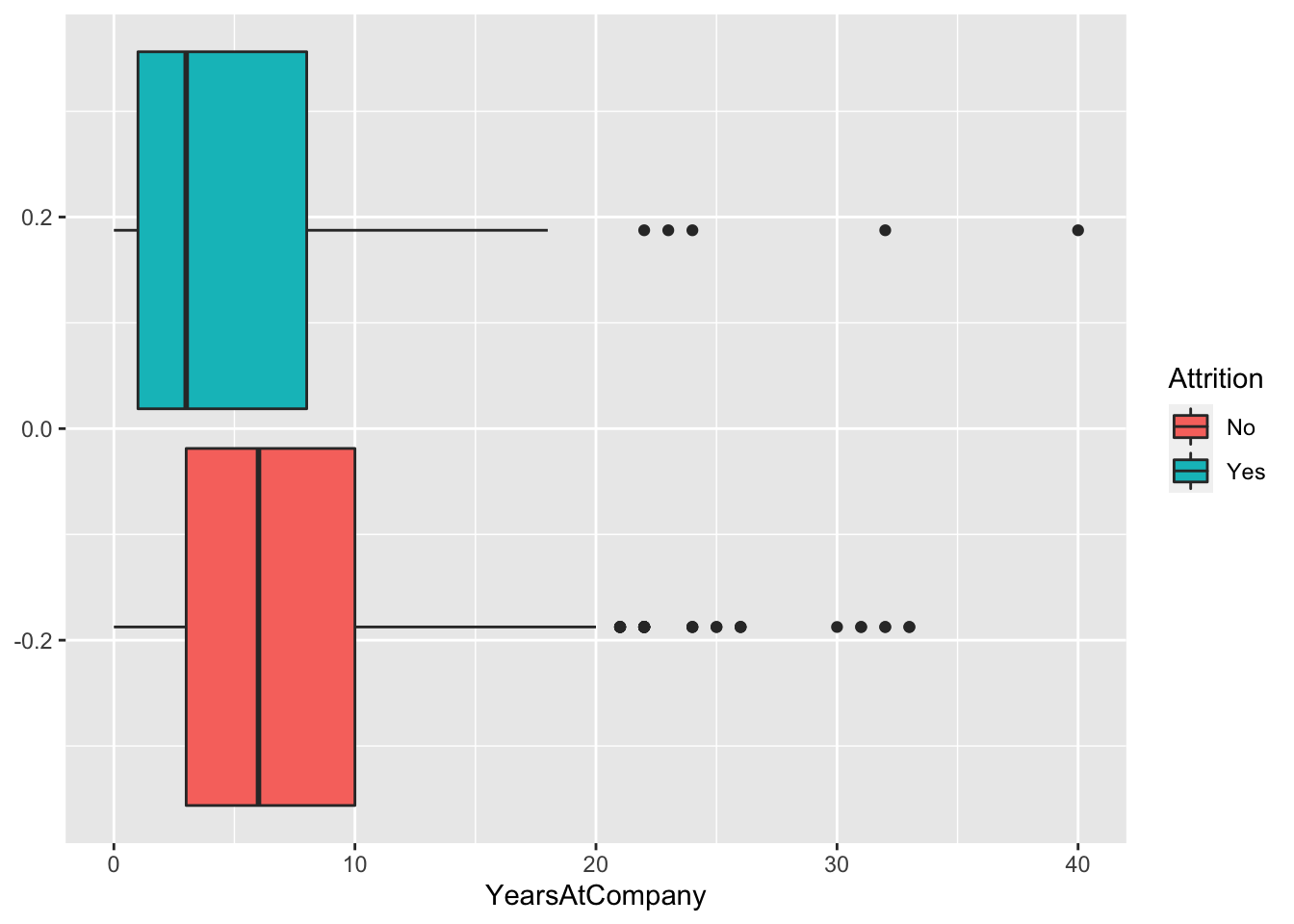 data %>% ggplot(aes(x = YearsAtCompany, fill = Attrition)) + geom_boxplot()