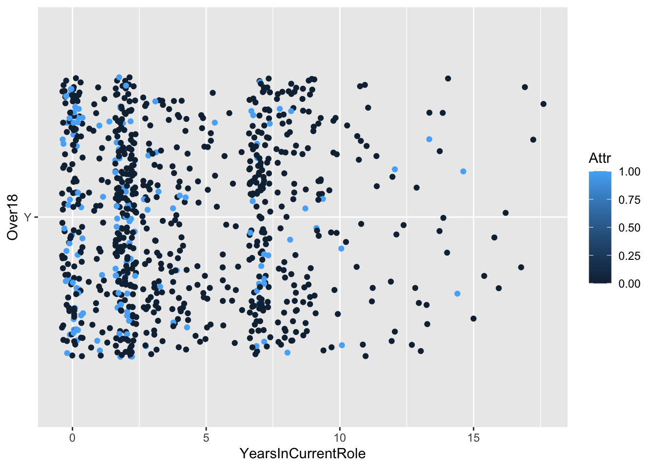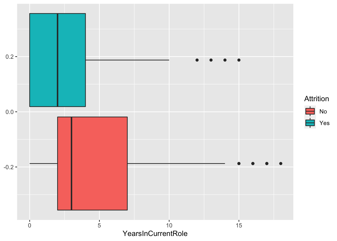 data %>% ggplot(aes(x = YearsInCurrentRole, fill = Attrition)) + geom_boxplot()