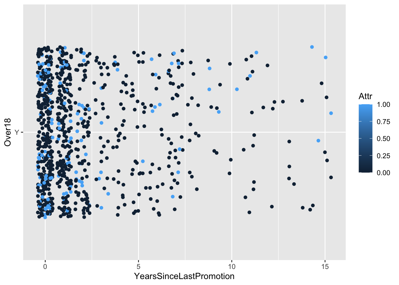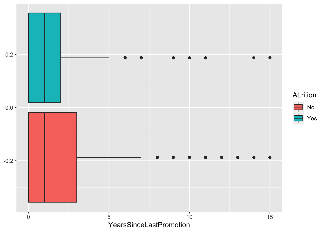 data %>% ggplot(aes(x = YearsSinceLastPromotion, fill = Attrition)) + geom_boxplot()