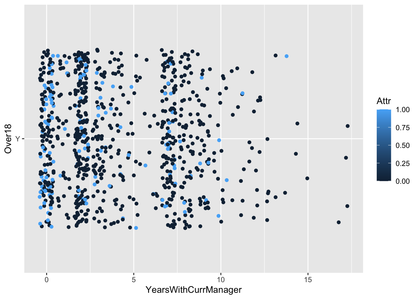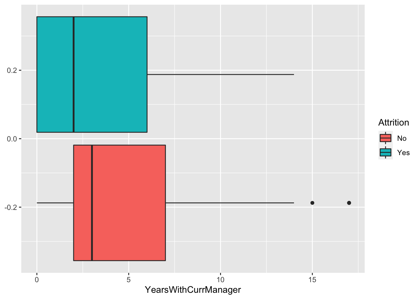 data %>% ggplot(aes(x = YearsWithCurrManager, fill = Attrition)) + geom_boxplot()