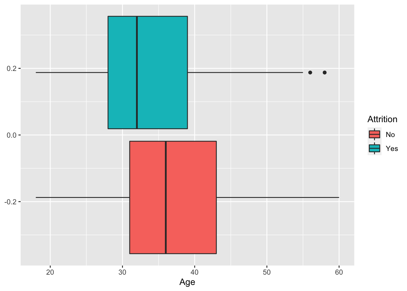 data %>% ggplot(aes(x = Age, fill = Attrition)) + geom_boxplot()
