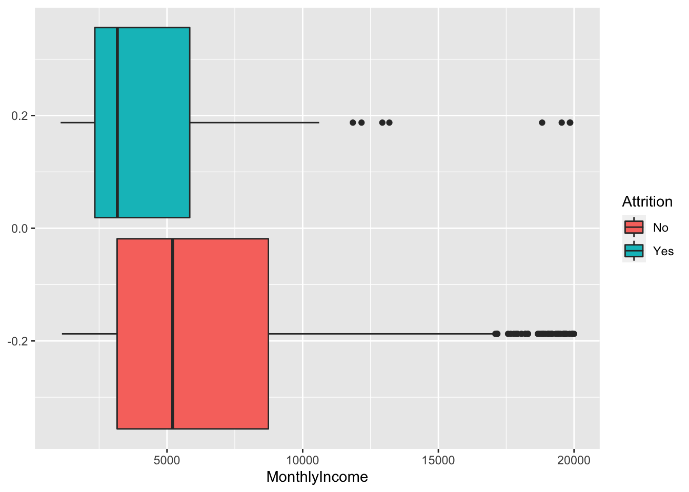 data %>% ggplot(aes(x = MonthlyIncome, fill = Attrition)) + geom_boxplot()