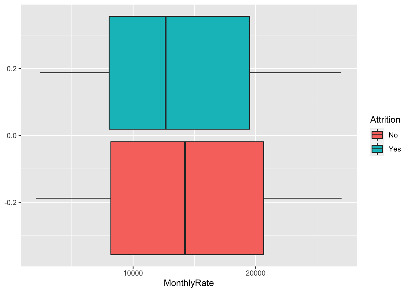 data %>% ggplot(aes(x = MonthlyRate, fill = Attrition)) + geom_boxplot()