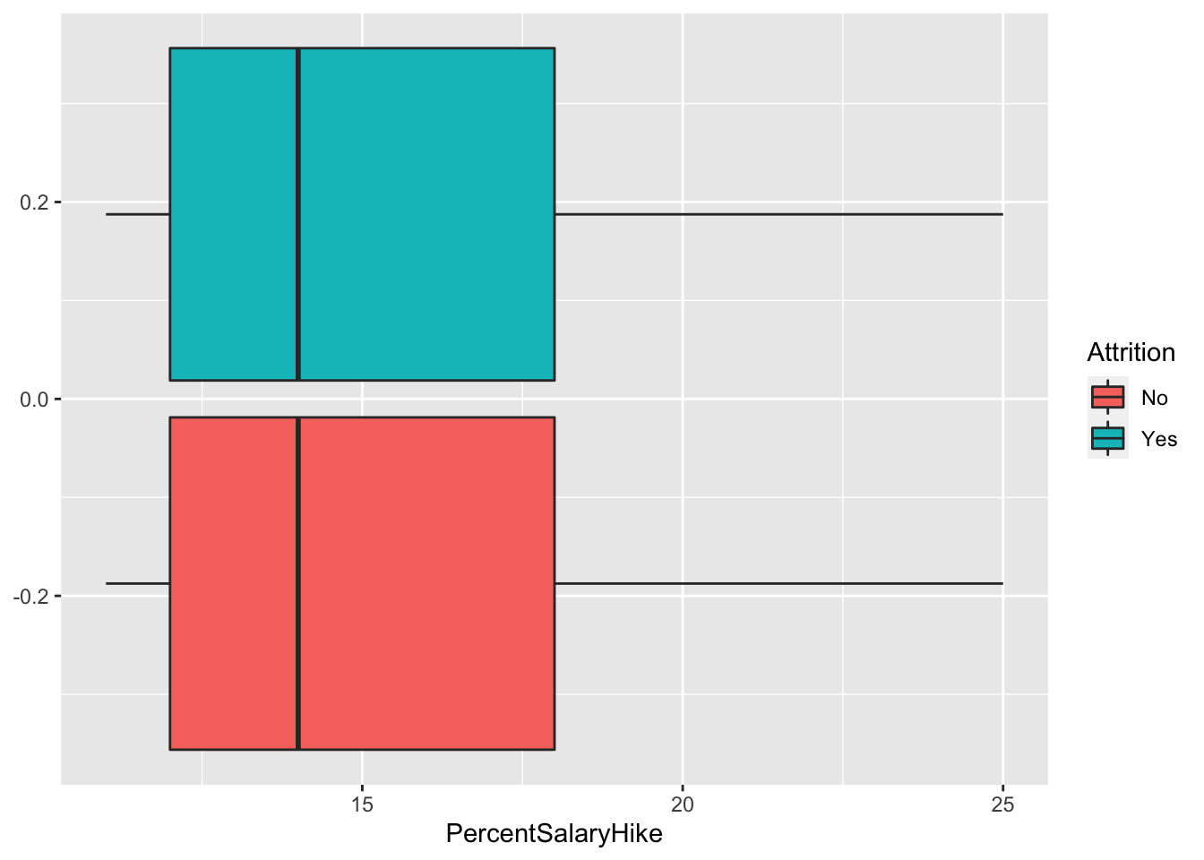 data %>% ggplot(aes(x = PercentSalaryHike, fill = Attrition)) + geom_boxplot()
