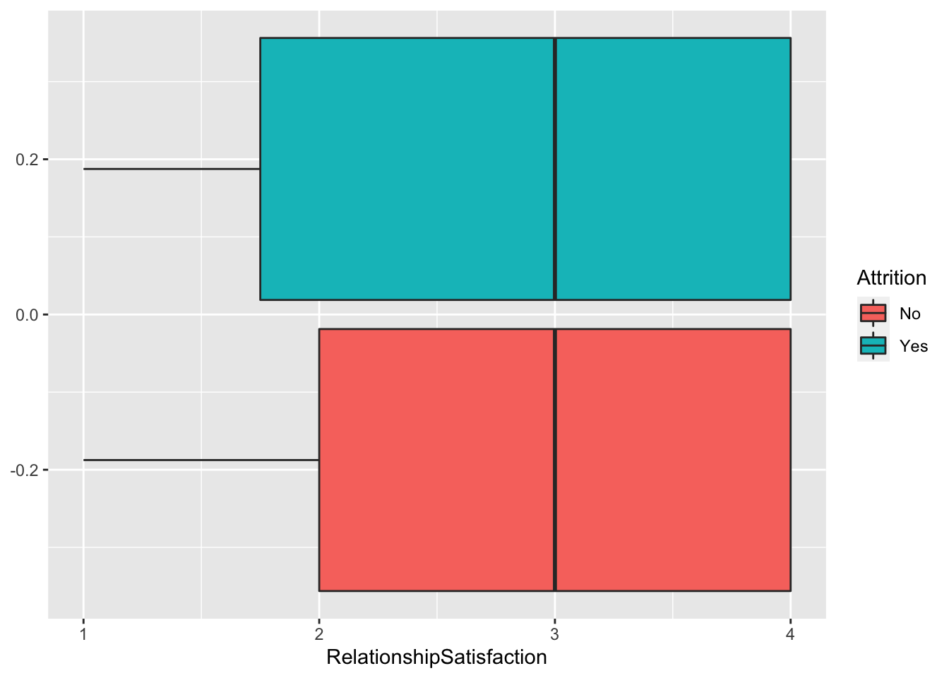 data %>% ggplot(aes(x = RelationshipSatisfaction, fill = Attrition)) + geom_boxplot()
