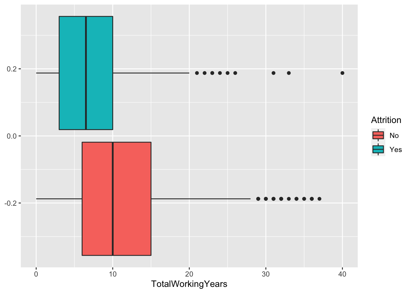 data %>% ggplot(aes(x = TotalWorkingYears, fill = Attrition)) + geom_boxplot()