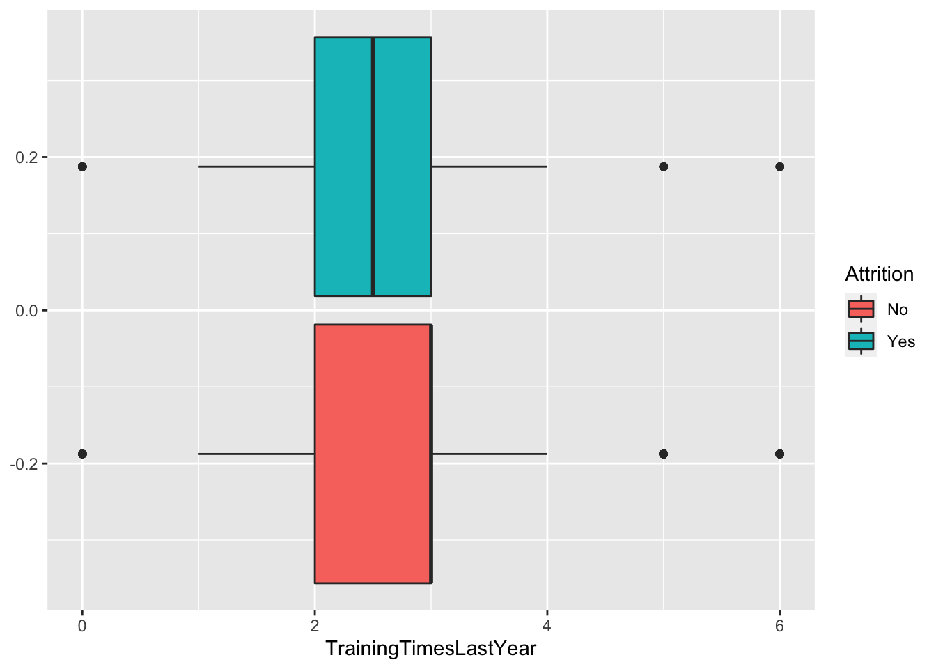 data %>% ggplot(aes(x = TrainingTimesLastYear, fill = Attrition)) + geom_boxplot()