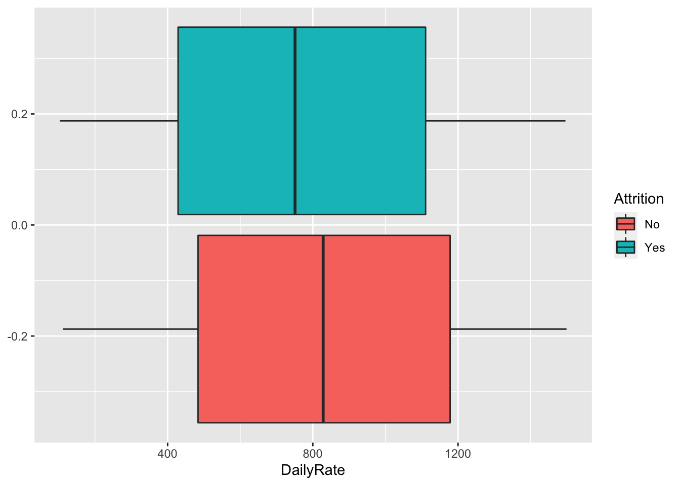 data %>% ggplot(aes(x = DailyRate, fill = Attrition)) + geom_boxplot()
