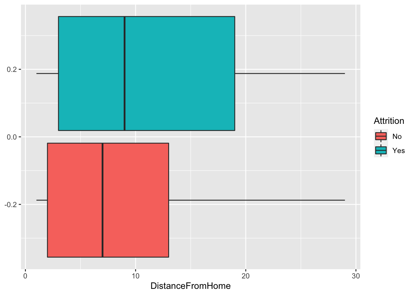 data %>% ggplot(aes(x = DistanceFromHome, fill = Attrition)) + geom_boxplot()