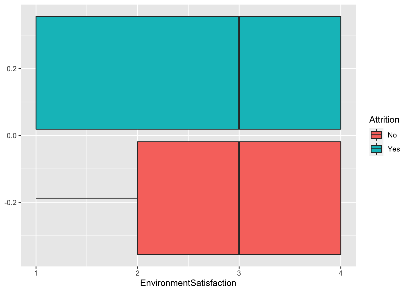 data %>% ggplot(aes(x = EnvironmentSatisfaction, fill = Attrition)) + geom_boxplot()