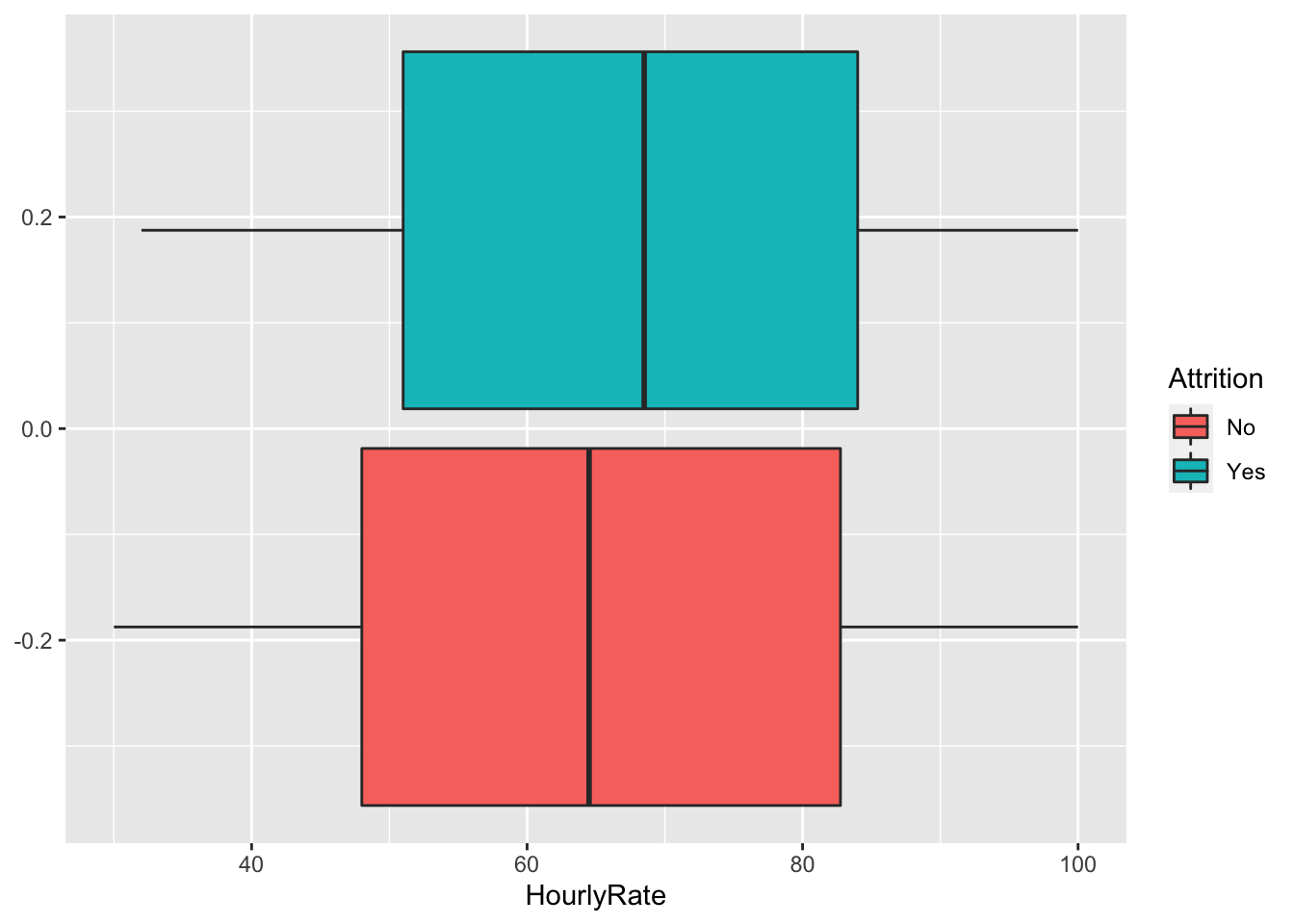 data %>% ggplot(aes(x = HourlyRate, fill = Attrition)) + geom_boxplot()