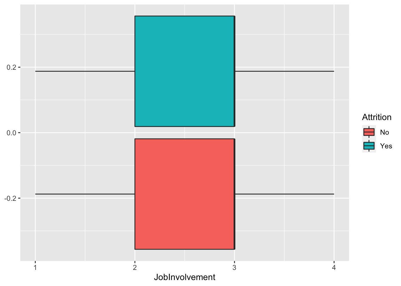 data %>% ggplot(aes(x = JobInvolvement, fill = Attrition)) + geom_boxplot()