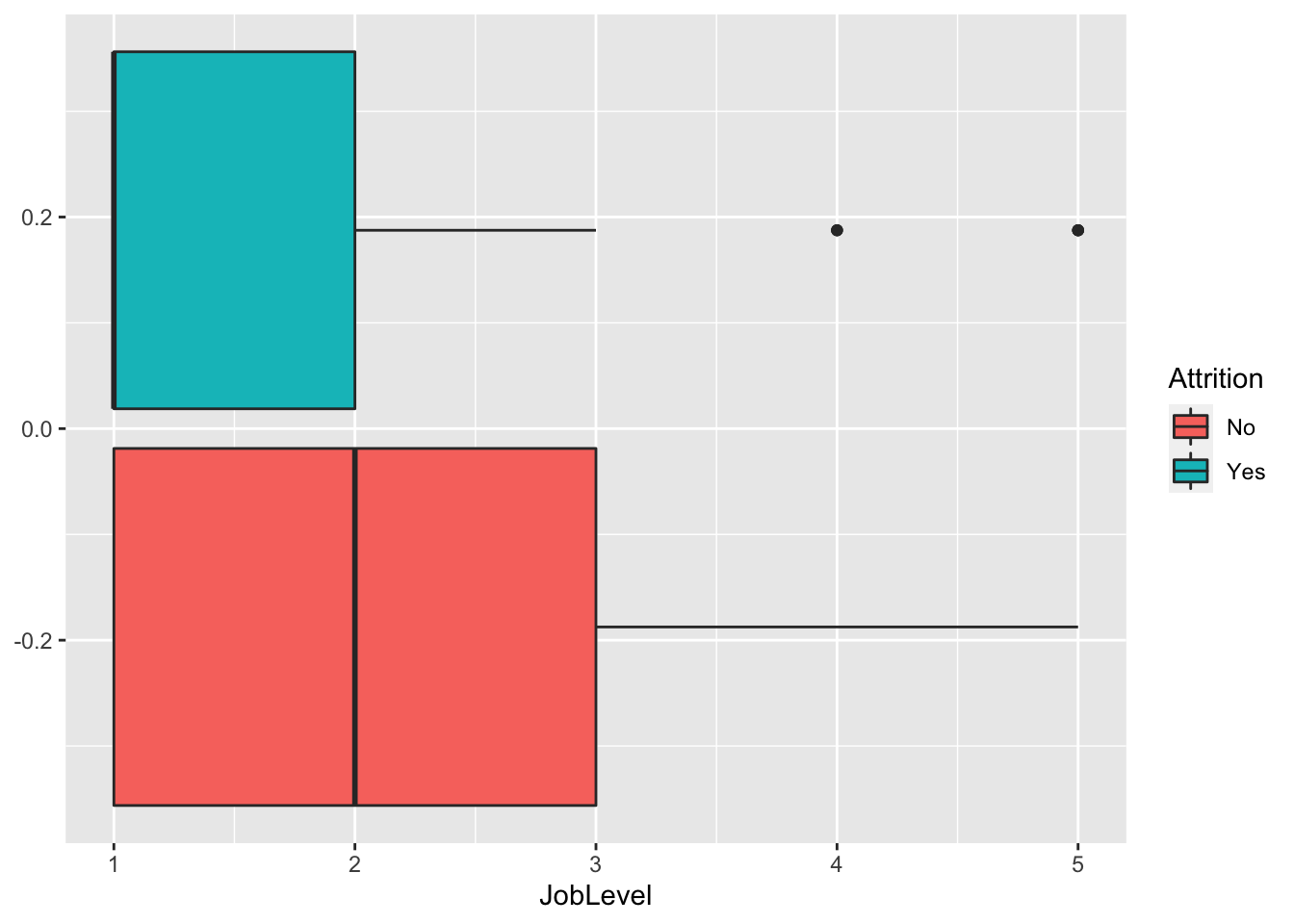 data %>% ggplot(aes(x = JobLevel, fill = Attrition)) + geom_boxplot()
