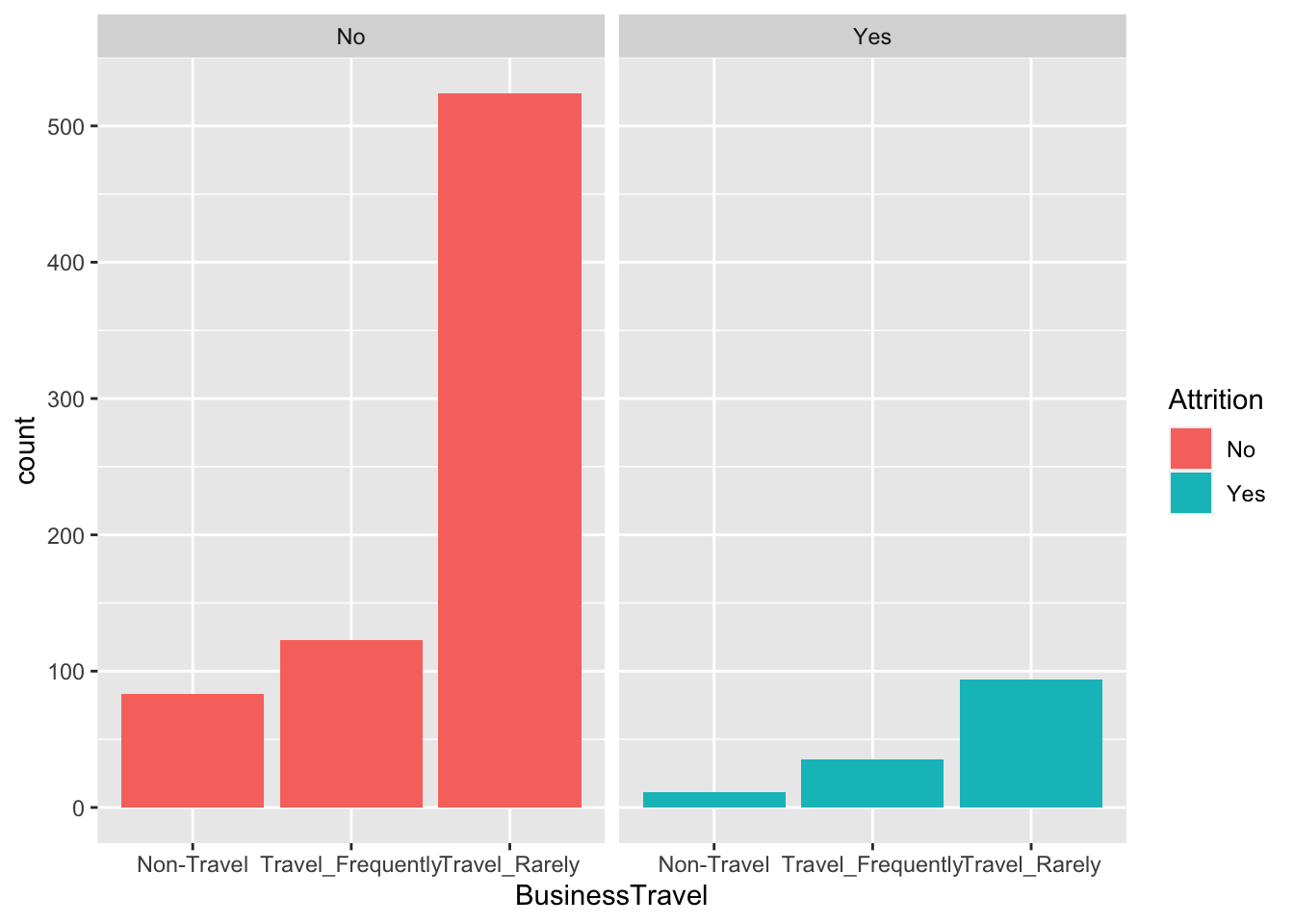 data %>% ggplot(aes(x = BusinessTravel, fill = Attrition)) + geom_histogram(stat = "count") + facet_wrap(~Attrition)