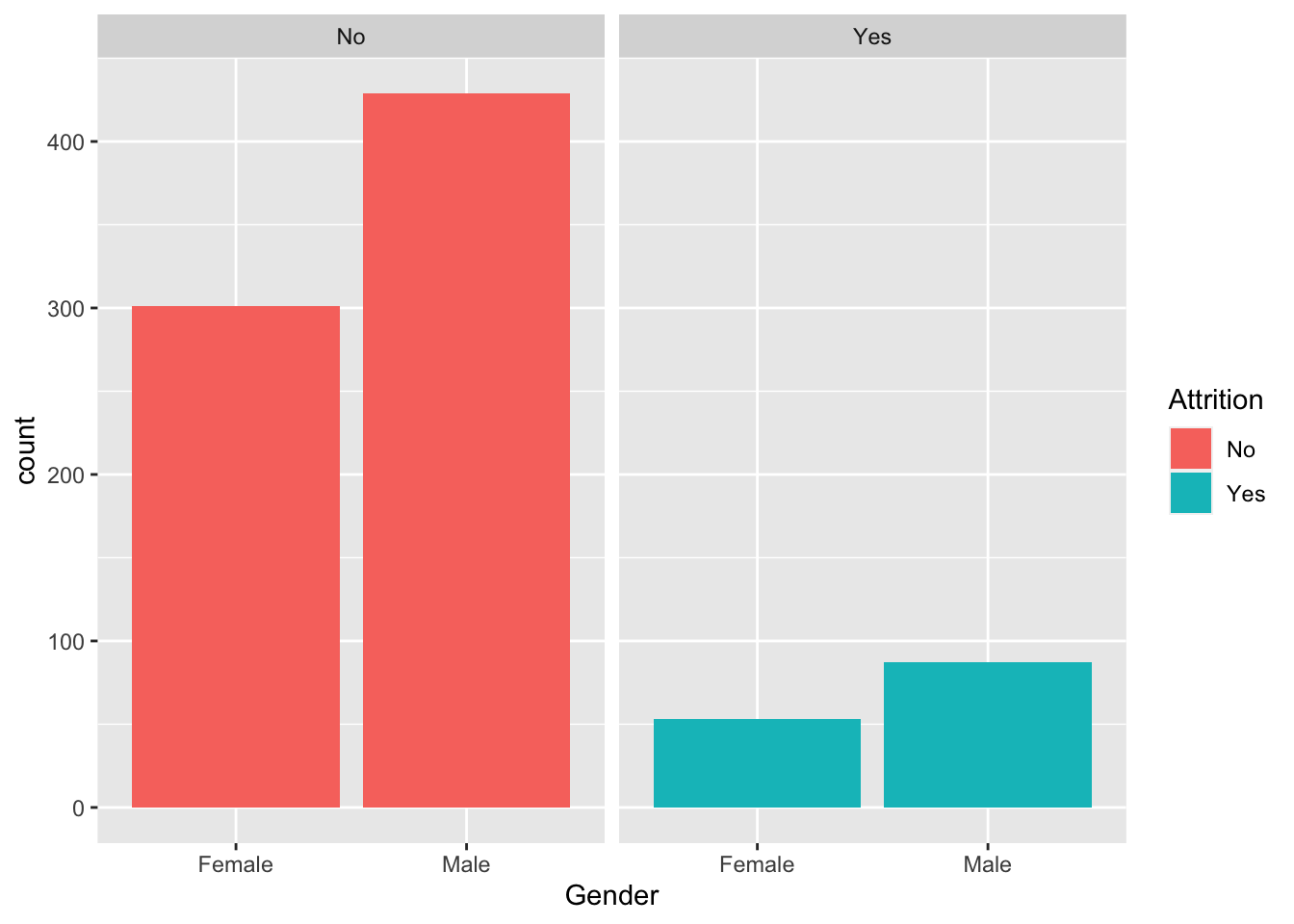 data %>% ggplot(aes(x = Gender, fill = Attrition)) + geom_histogram(stat = "count") + facet_wrap(~Attrition)