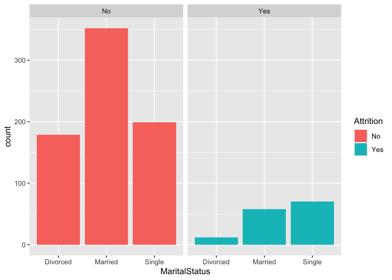 data %>% ggplot(aes(x = MaritalStatus, fill = Attrition)) + geom_histogram(stat = "count") + facet_wrap(~Attrition)
