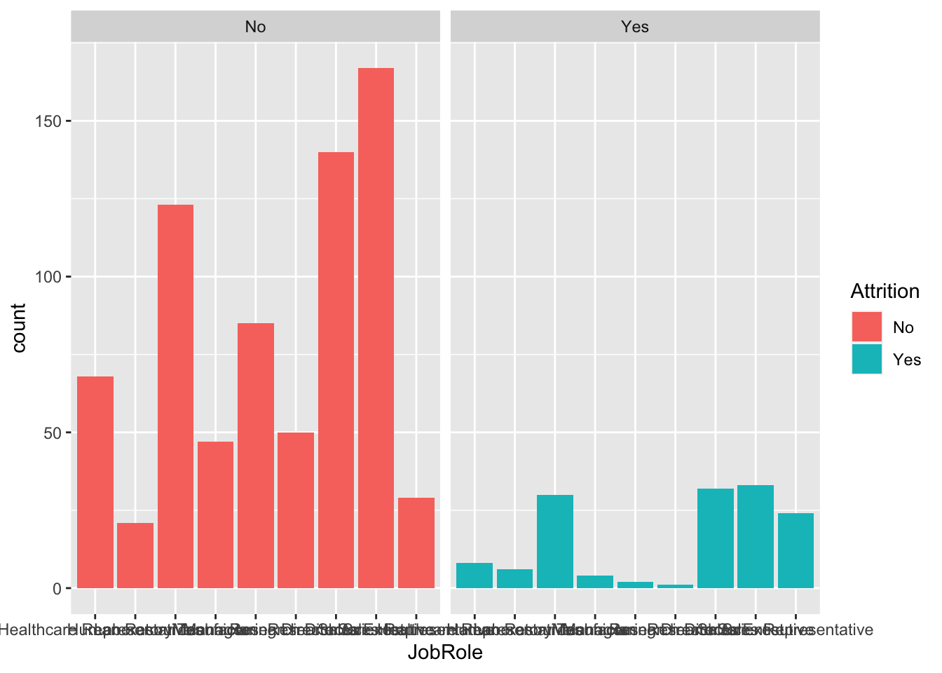 data %>% ggplot(aes(x = JobRole, fill = Attrition)) + geom_histogram(stat = "count") + facet_wrap(~Attrition)