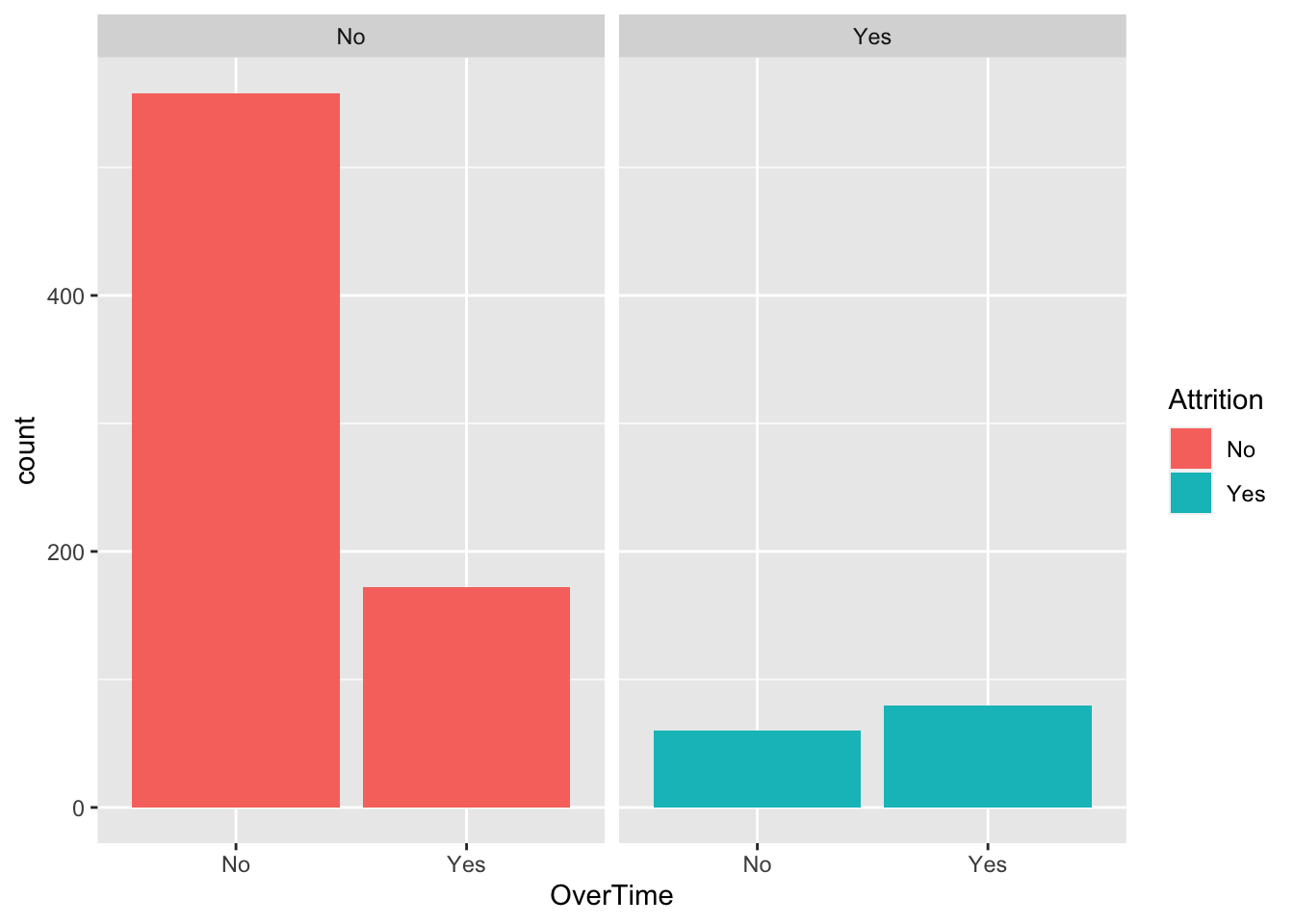 data %>% ggplot(aes(x = OverTime, fill = Attrition)) + geom_histogram(stat = "count") + facet_wrap(~Attrition)