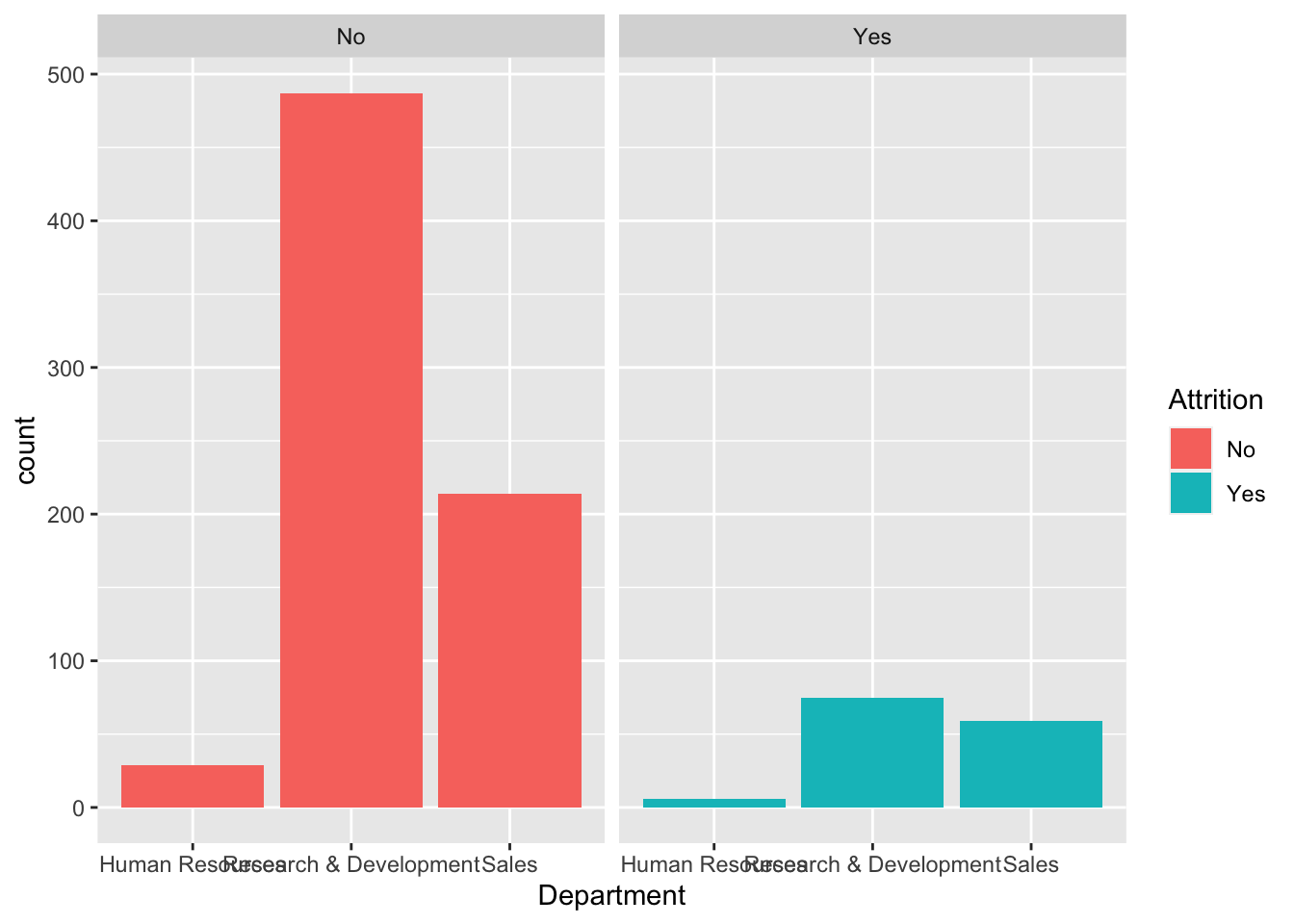 data %>% ggplot(aes(x = Department, fill = Attrition)) + geom_histogram(stat = "count") + facet_wrap(~Attrition)